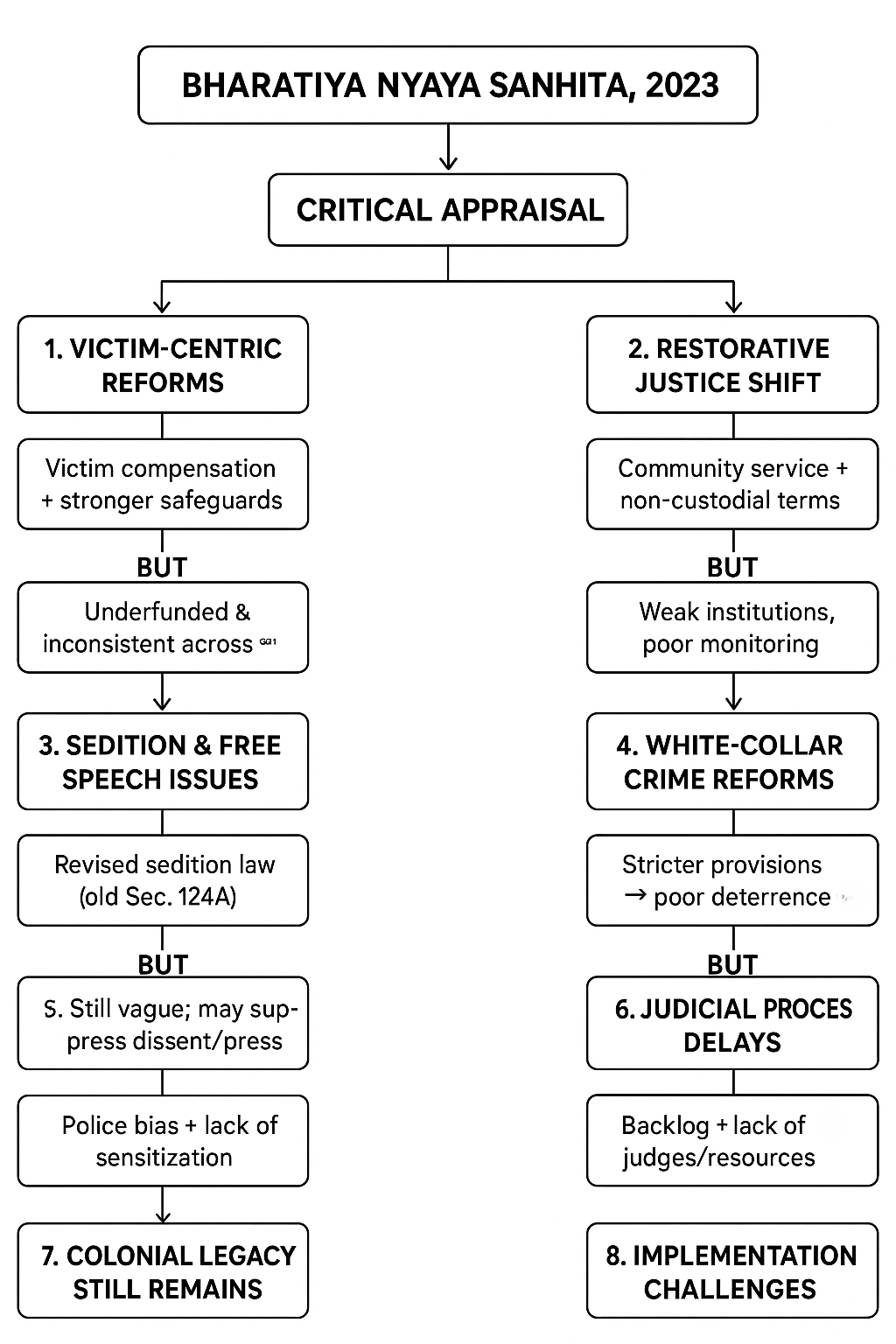 8. Skepticism Regarding Implementation Despite the progressive aspirations of the BNS, there is skepticism regarding its implementation. India’s legal and law enforcement infrastructure is not adequately equipped to handle such a major transformation. Issues like police corruption, judicial delays, and poor victim support systems may undermine the impact of these reforms.
