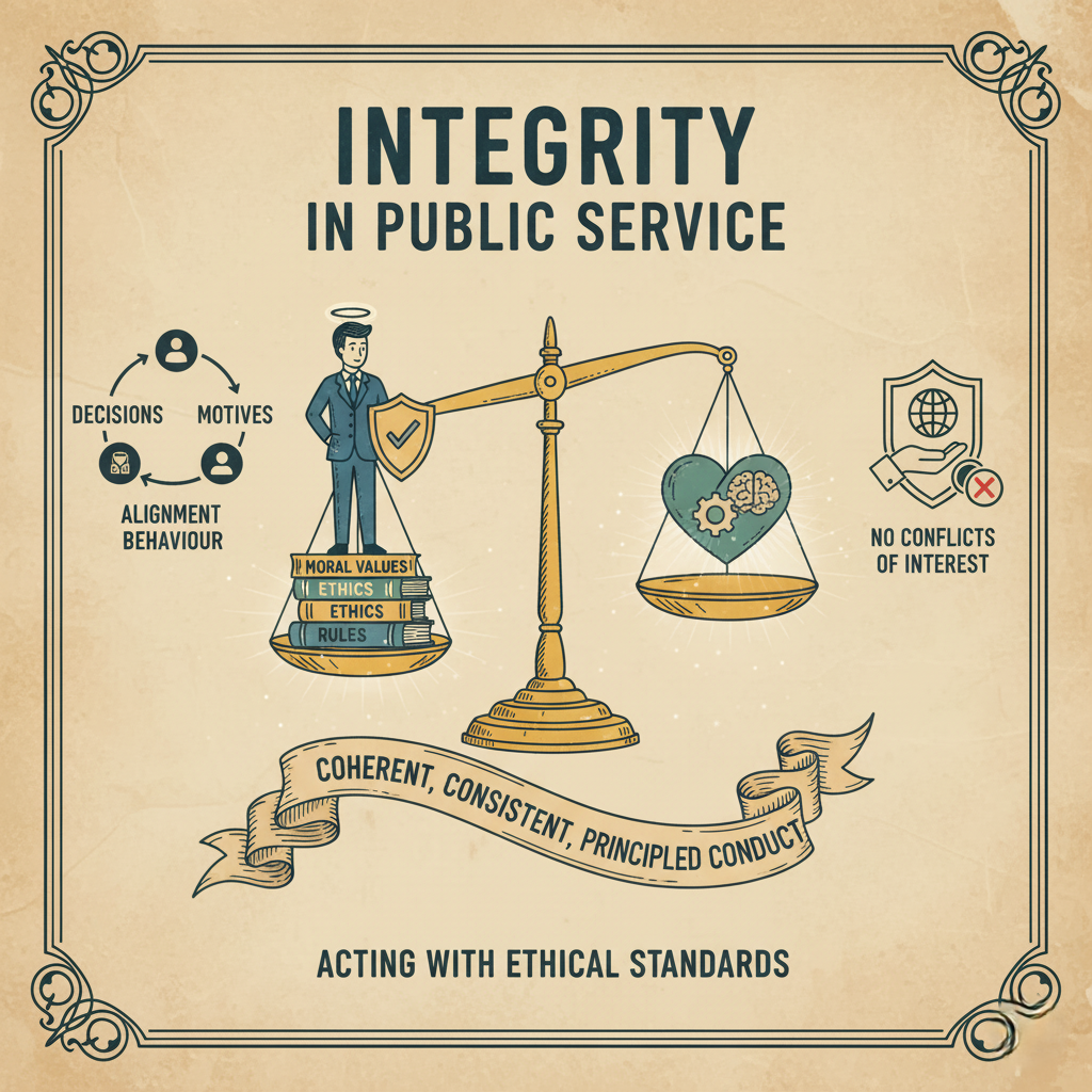 Integrity (broad): acting in accordance with a set of moral values, norms and rules in a coherent, consistent and principled way — not merely avoiding lies but aligning one’s whole conduct (decisions, motives, commitments and behaviour) with ethical standards. In public administration the idea also includes the avoidance of conflicts of interest and the protection of public interest.